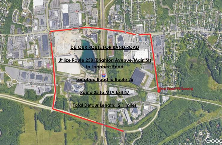 As soon as Rand Road if finished, Larrabee Road will be closed and traffic will be detoured onto Rand Road so the railroad crossing on Larrabee Road can be completed. Traffic will be detoured along the Westbrook Arterial to Rand Road to Route 25B (Brighton Avenue/Main St) to Larrabee Road. It is anticipated that rail replacement work on both crossings will be complete by July 30th.