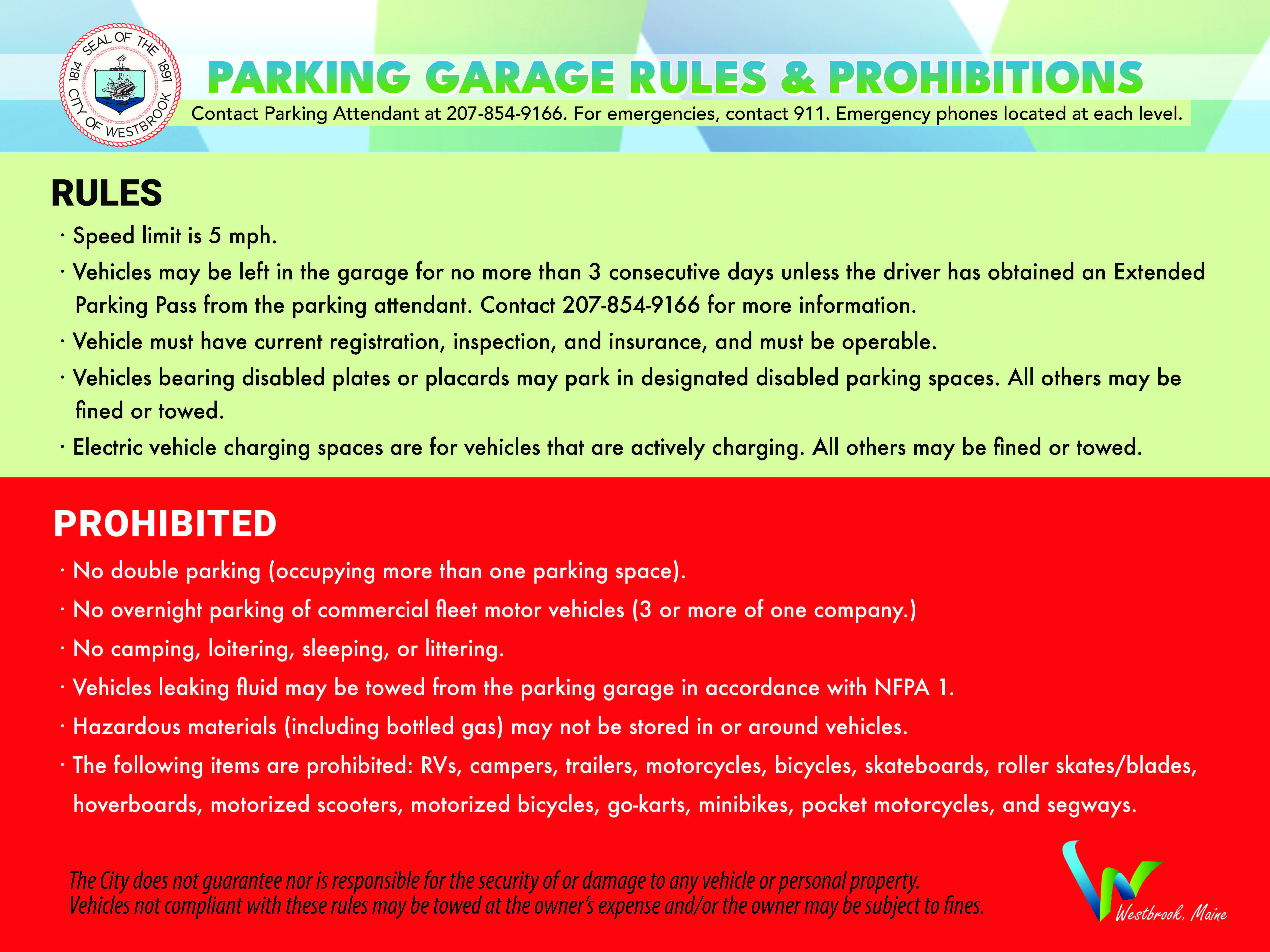 Westbrook's latest public infrastructure facility is a five-level public parking garage. Free parking is available 24/7 with designated handicap spaces on the first floor. This garage features around-the-clock safety and surveillance systems, bright LED lighting on the interior and exterior of the building, elevator, protection from the weather, two emergency call boxes on each floor and two high visibility glass-sided stairwells offering a birds-eye view of the Westbrook skyline. It is situated in the heart of downtown for quick and easy access to wherever you need to go, including a new Metro bus stop on the Husky Line between University of Southern Maine campuses.