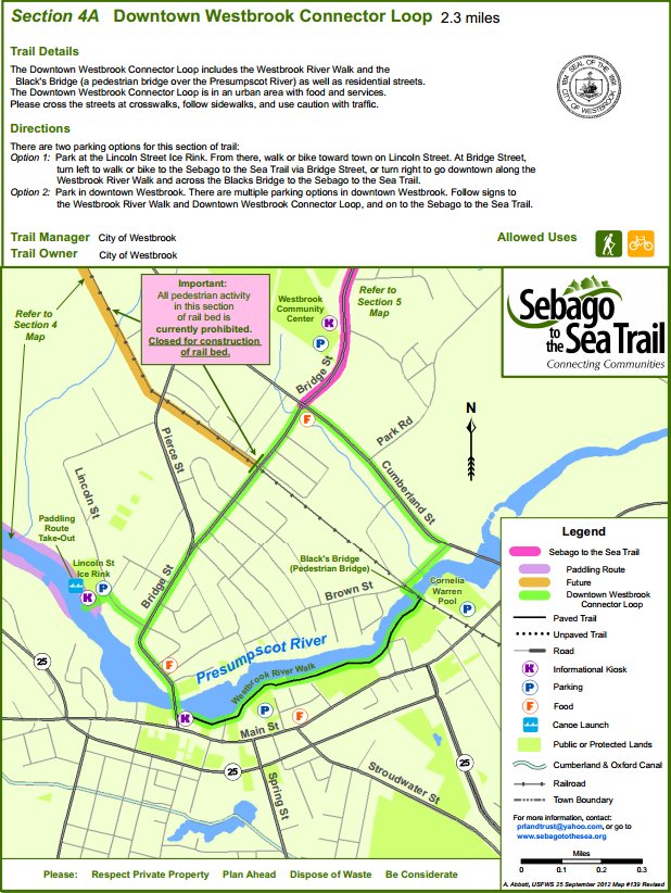 - Option 2: Park in downtown Westbrook. There are multiple parking options in downtown Westbrook. Follow signs to the Westbrook River Walk and Downtown Westbrook Connector Loop, and on the Sebago to the Sea Trail.